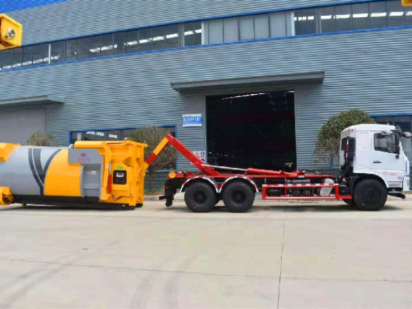 勾臂垃圾車【車廂可卸式垃圾車】車體和垃圾箱可完全分離,由液壓系統(tǒng)來完成收箱/放箱,在平日里可將車載垃圾箱放置到各個垃圾收集點,待垃圾收集滿后,該車可直接開赴收集點,通過液壓系統(tǒng)的操控,可將垃圾車后座上加裝的勾臂放下,掛住站內(nèi)箱體前端的連接點,將垃圾箱拉**車體的后座上,此時即可開動車輛,將垃圾運送垃圾處理站內(nèi),進行自卸式傾倒,優(yōu)點就是可一車配多斗,一輛車就可以維持數(shù)個垃圾收集站的運轉(zhuǎn),效率高,且箱體為密封式設(shè)計,不會造成二次污染。