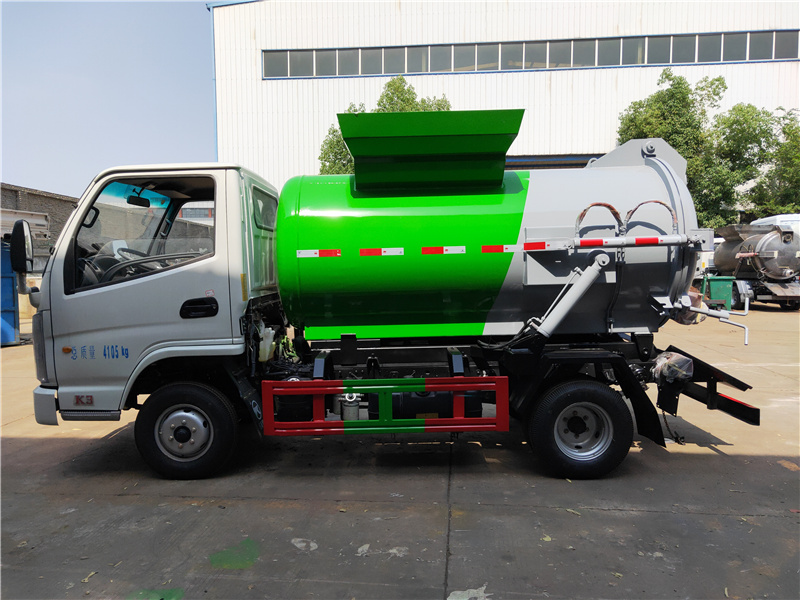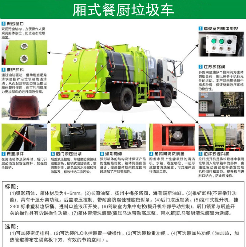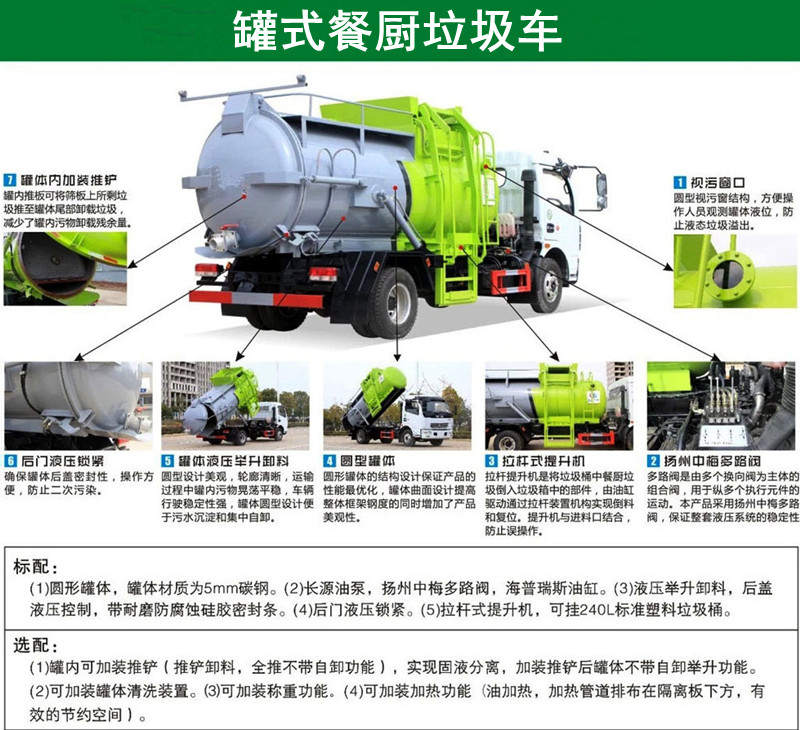 方罐式餐廚垃圾車:弧形廂體,箱體內(nèi)可實現(xiàn)固液分離,推鏟卸料,后蓋液壓開啟/鎖緊(帶耐磨橡膠密封條密封-后門關(guān)閉后滴水不漏),后門液壓鎖緊防誤操作功能,掛桶式提升機,可配合120升、240升標(biāo)準(zhǔn)垃圾桶使用,清洗裝置(帶水箱、液壓馬達帶動高壓泵)。