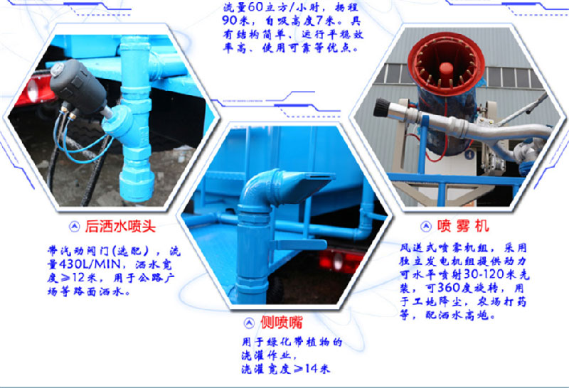 上裝配置:罐體采用國(guó)標(biāo)Q235碳鋼板材制作,產(chǎn)品質(zhì)量成熟可靠,設(shè)計(jì)**合理,比同類灑水泵吸程遠(yuǎn)、壓力大、使用壽命長(zhǎng),可泵進(jìn)泵出。前沖、后灑、側(cè)噴、高位花灑、帶后工作平臺(tái)及綠化灑水高炮(可全方位旋轉(zhuǎn),可連續(xù)調(diào)成直沖狀、大雨、小雨、毛毛雨等),抑塵霧炮(可降塵、噴霧、消毒、打農(nóng)藥等),水位計(jì),消防栓接口、快速接口、兩根輸水管,其余標(biāo)配。